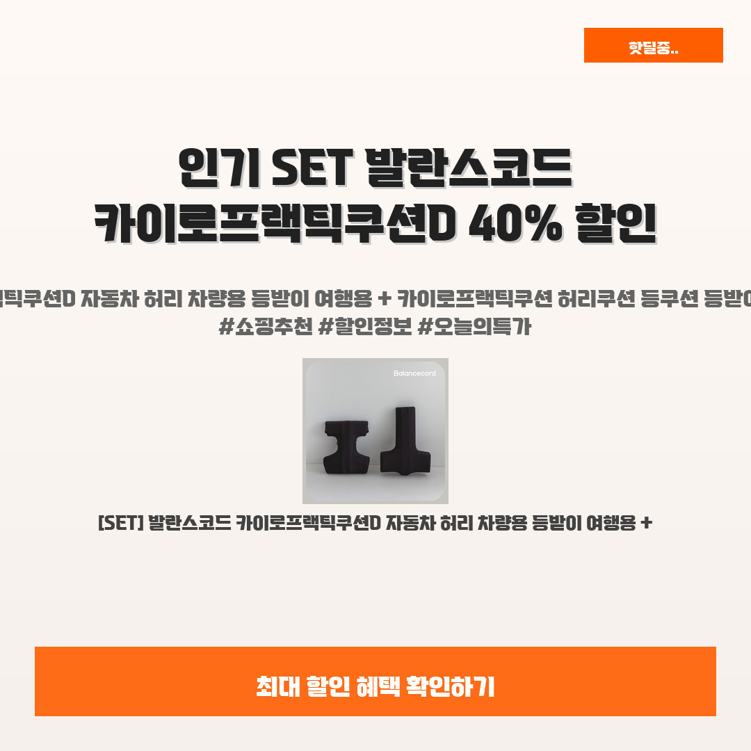 🛍️ 이 포스팅은 네이버 쇼핑 커넥트 활동의 일환으로,판매 발생 시 수수료를 제공받습니다.오늘 소개할 제품은 단언컨데,,그야말로 완벽한, 갓벽한, 감동적인 제품입니다!여러분, 장시간 자동차 운전으로 허리가 아프신 적 있으신가요? 여행 중 의자에 앉아 있을 때 허리 지지대가 필요하다고 느낀 적도 많으실 텐데요. 그런 스트레스를 해결해 줄 아이템이 바로 [SET] 발란스코드 카이로프랙틱쿠션D입니다!이 제품은 자동차와 의자에서 모두 사용할 수 있는 최상의 허리 쿠션으로, 당신의 허리 부담을 덜어 줄 완벽한 해결책이에요. 40% 할인된 가격으로 더 이상 망설이지 마세요!많은 분들이 이미 극찬을 아끼지 않는 이 쿠션, 사용해보고 나면 그 진가를 알게 될 거예요. 가성비와 편안함을 모두 잡은 이 기회를 놓치지 마..